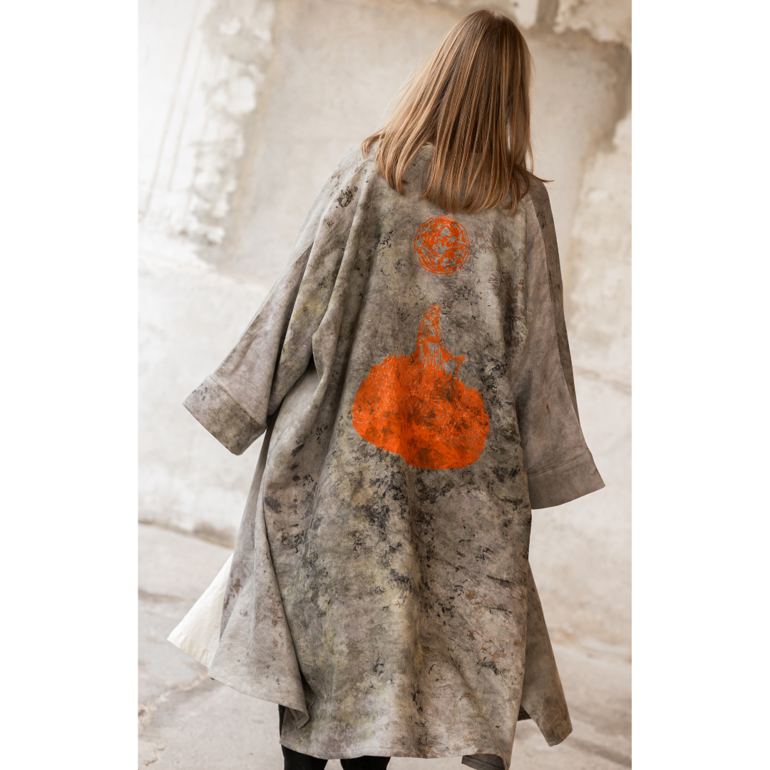 Kære sjæl, når du bærer denne kåbe, træder du ind i en dyb forbindelse med jordens rytme. Kåben er farvet med eukalyptus, og bærer en kraft kendt for renselse, beskyttelse og indre styrke. Som eukalyptustræet selv, stærkt og fleksibelt, inviteres du til at stå rodfæstet og samtidig bevæge dig frit, med klarhed og retning. Der findes altid en ny vej, en begyndelse, og vejen bliver tydeligere, jo friere du kan trække vejret i dit eget liv.