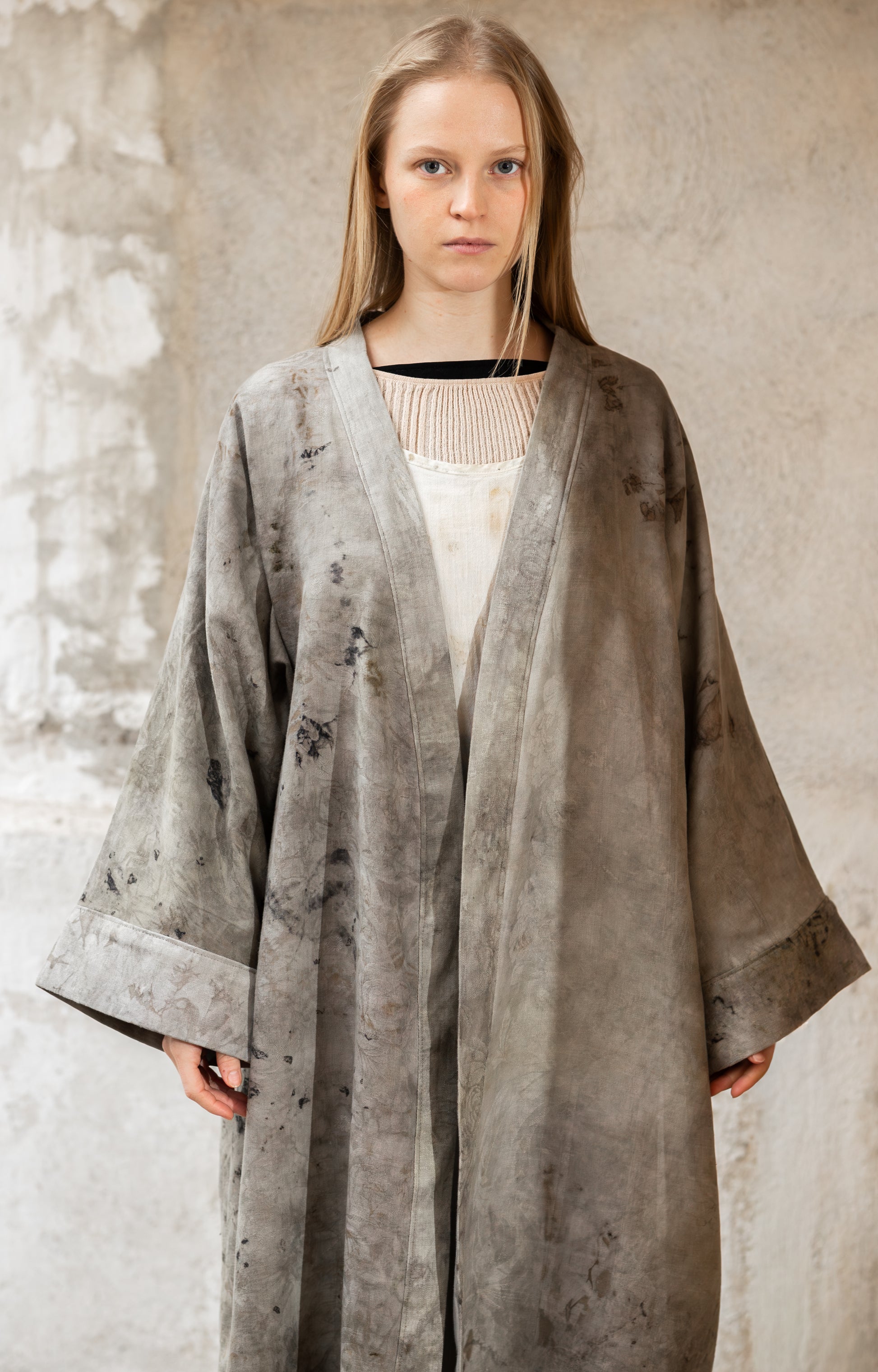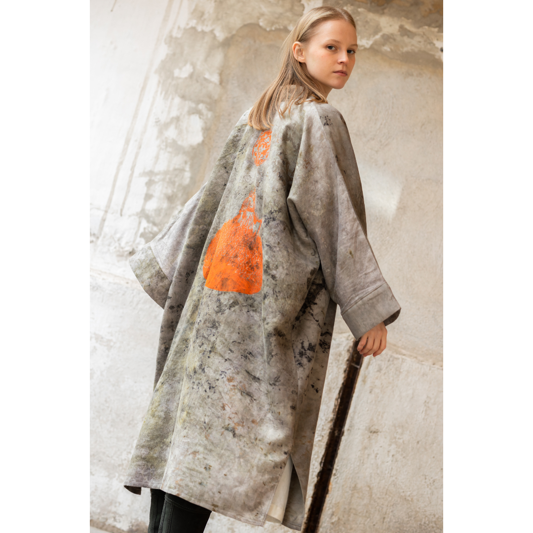 Mine kåbedesigns er omhyggeligt farvet med blomster og rødder. Jeg bruger en naturlig farvemetode kaldet bundledying. Til disse dye´s bruger jeg blomster fra min egen have og fra min lokale omgivelser. Broderierne er håndlavet og intuitivt sammensatte og forskellige fra kåbe til kåbe. Det betyder, at ikke to kåber er ens. Kåben er velegnet til alle lejligheder - sommer som vinter.
