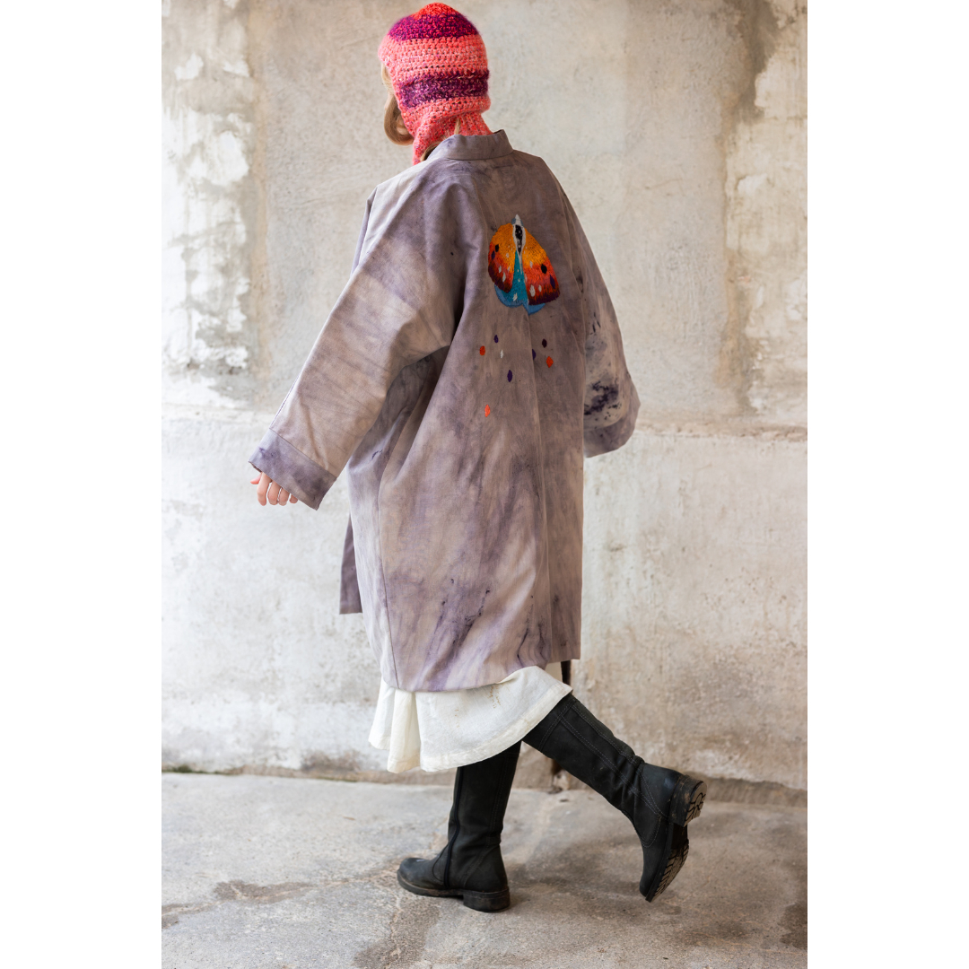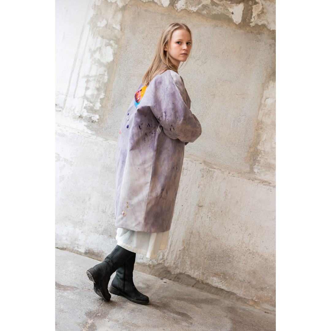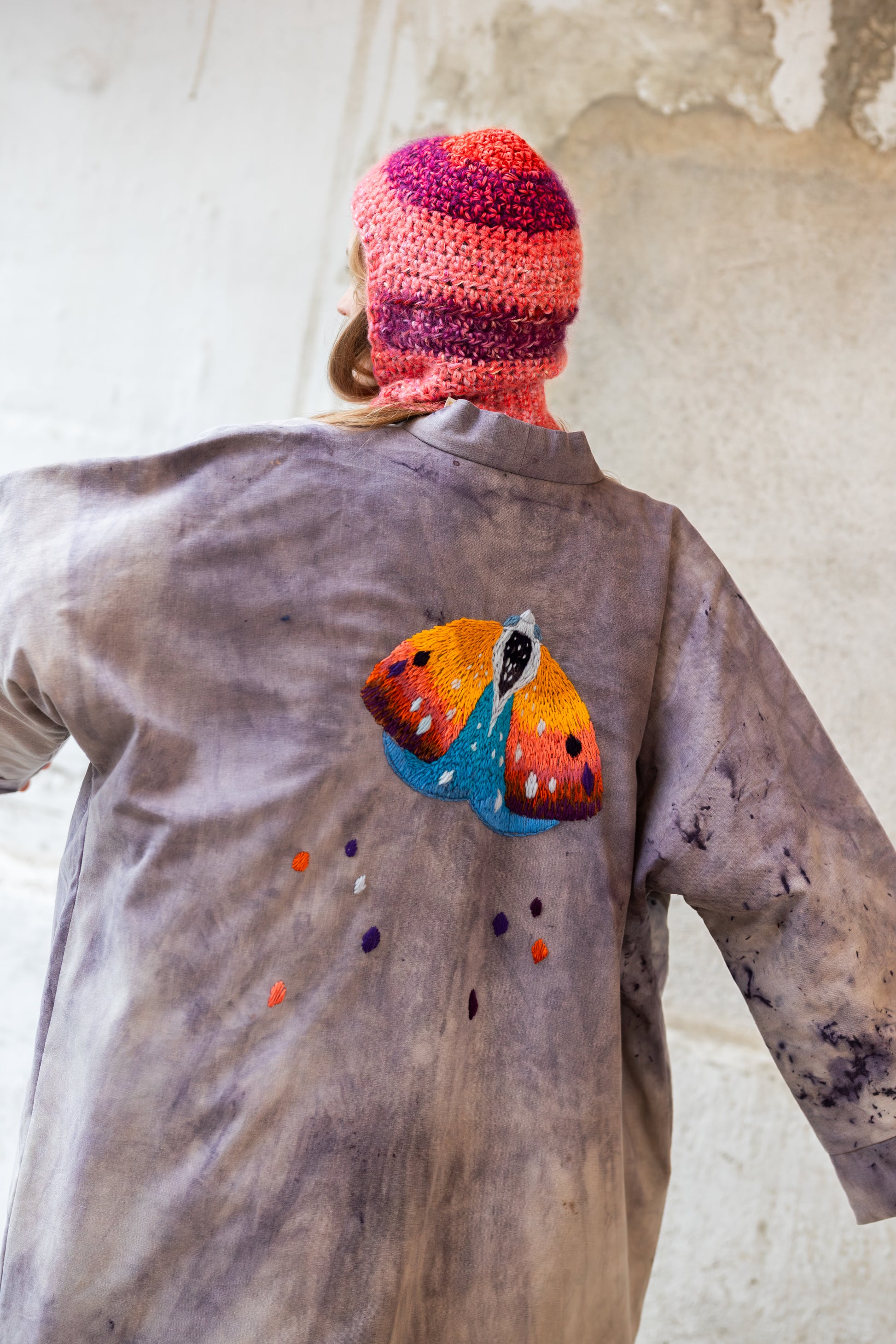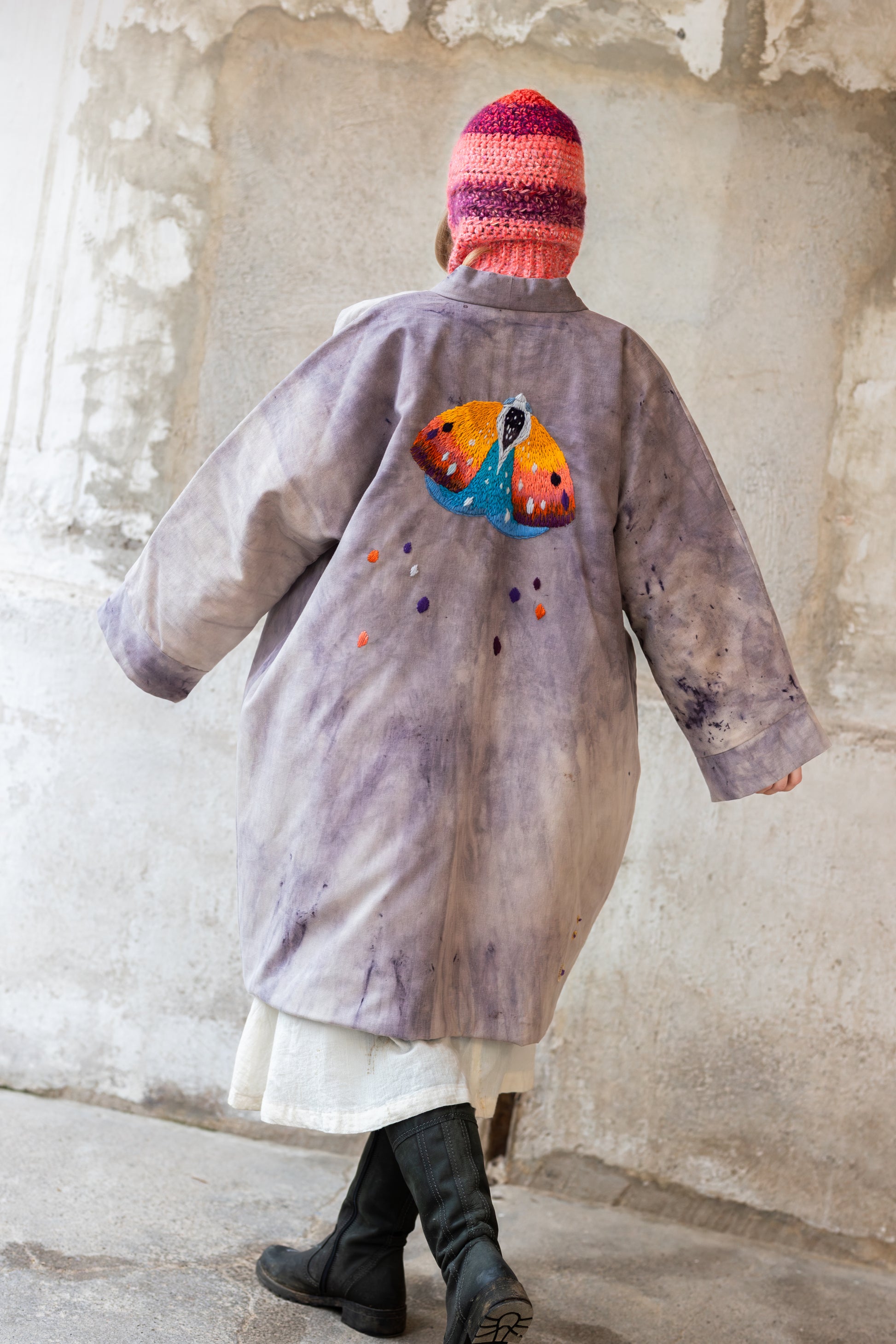 Mine kåbedesigns er omhyggeligt farvet med blomster og rødder. Jeg bruger en naturlig farvemetode kaldet bundledying. Til disse dye´s bruger jeg blomster fra min egen have og fra min lokale omgivelser. Broderierne er håndlavet og intuitivt sammensatte og forskellige fra kåbe til kåbe. Det betyder, at ikke to kåber er ens. Kåben er velegnet til vinter. Kåben er foret med vatteret for, for maksimal varme; fra upcycled plasticflasker.