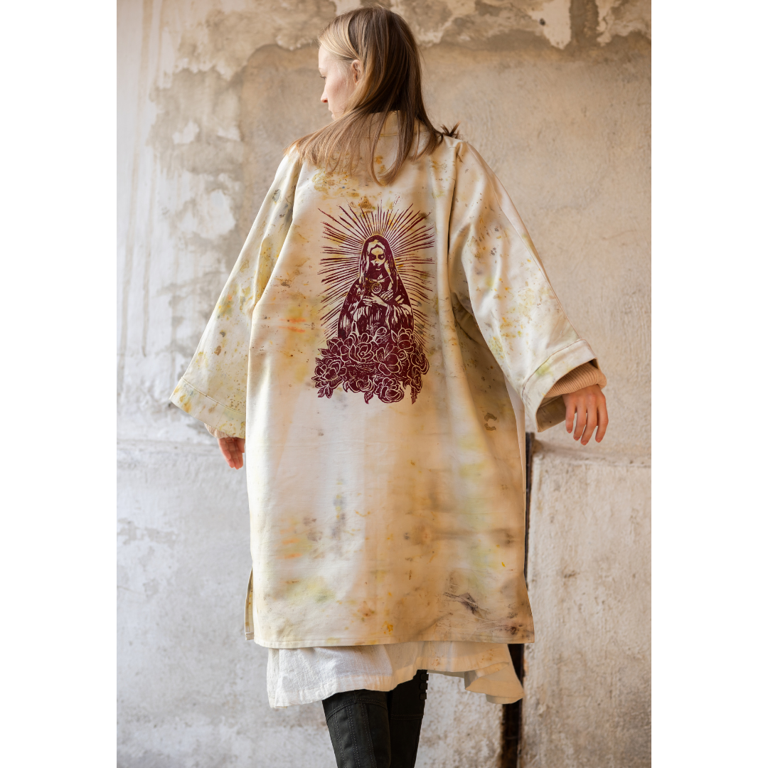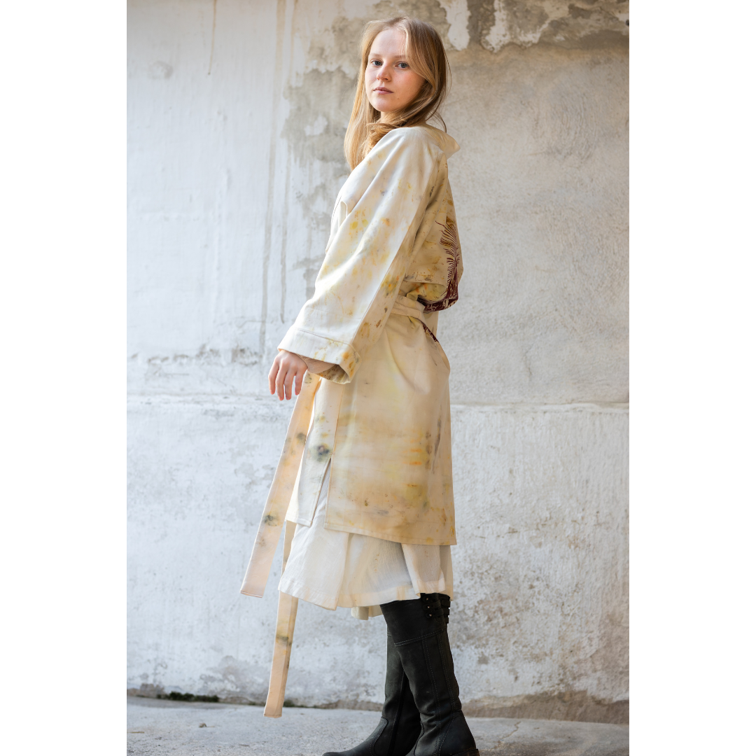 Mine kåbedesigns er omhyggeligt farvet med blomster og rødder. Jeg bruger en naturlig farvemetode kaldet bundledying. Til disse dye´s bruger jeg blomster fra min egen have og fra min lokale omgivelser. Broderierne er håndlavet og intuitivt sammensatte og forskellige fra kåbe til kåbe. Det betyder, at ikke to kåber er ens. Kåben er velegnet til alle lejligheder - sommer som vinter.