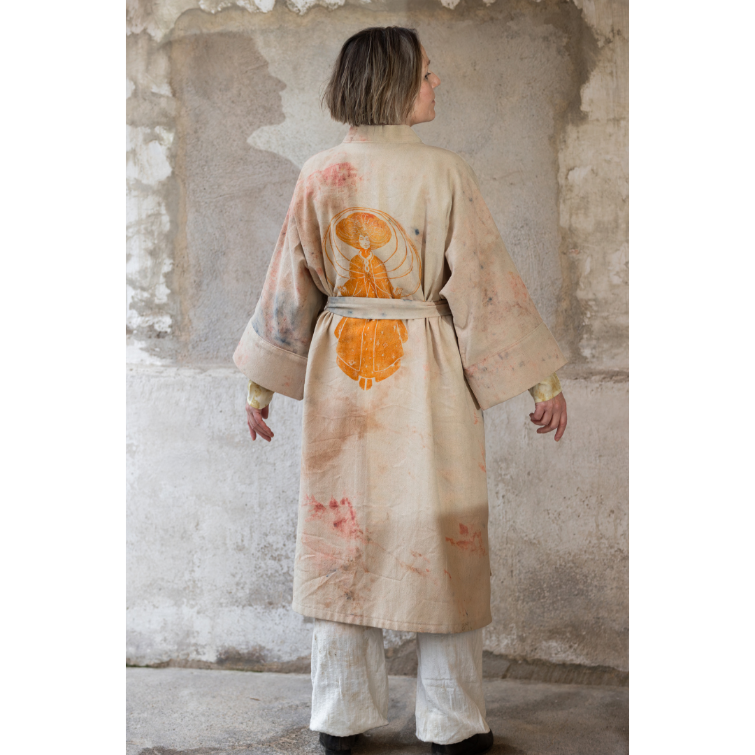 Mine kåbedesigns er omhyggeligt farvet med blomster og rødder. Jeg bruger en naturlig farvemetode kaldet bundledying. Til disse dye´s bruger jeg blomster fra min egen have og fra min lokale omgivelser. Broderierne er håndlavet og intuitivt sammensatte og forskellige fra kåbe til kåbe. Det betyder, at ikke to kåber er ens. Kåben er velegnet til alle lejligheder - sommer som vinter.