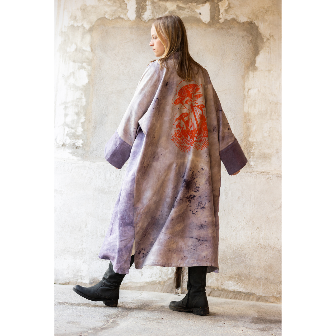 Mine kåbedesigns er omhyggeligt farvet med blomster og rødder. Jeg bruger en naturlig farvemetode kaldet bundledying. Til disse dye´s bruger jeg blomster fra min egen have og fra min lokale omgivelser. Broderierne er håndlavet og intuitivt sammensatte og forskellige fra kåbe til kåbe. Det betyder, at ikke to kåber er ens. Kåben er velegnet til alle lejligheder - sommer som vinter.
