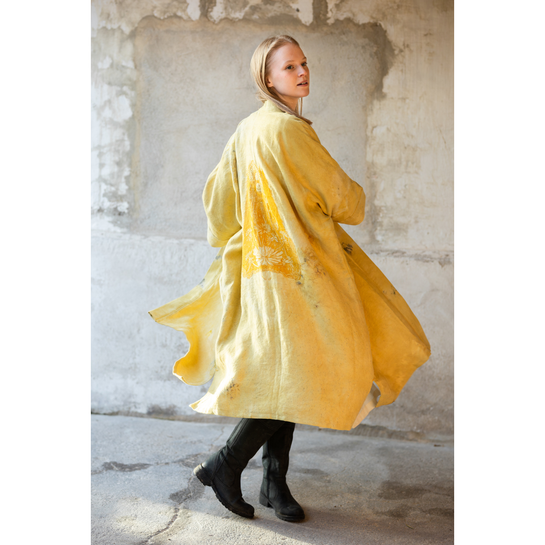 Kære sjæl, når du bærer denne kåbe, træder du ind i solen og sommerens klare energifelt. Kåben er farvet med myrobalan, frugten fra Terminalia-chebula-træet, kendt som en bærer af renselse, lys og indre justering. Og med den fine blomstring fra Cosmos, som ønsker at stabilisere indre harmoni i blodsukker og hjerte. Sammen væver de en gammel visdom, der arbejder nænsomt i dit energifelt, opløser det tunge og styrker din livskraft, som en stille alkymist, der guider dig tilbage til dit sande blueprint.